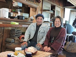 くれたお茶をストーブの傍ですする。昔の工具や農機具などが置かれていて飽きない。