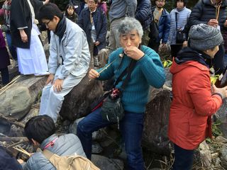 に獲った鳥獣の供養の神事が行われる。その後回りの見学者たちにお神酒がふるまわれその後