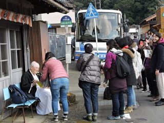 川原から道路に戻ると見学者のリクエストにより「銀鏡の本」に著者の即席のサイン会が始まった。