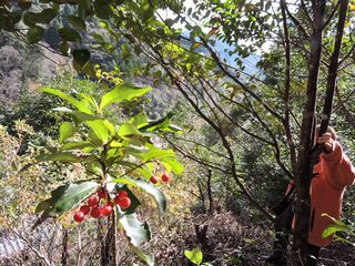 踏まないように歩く。野いちご、マンリョウ、ウラジロなど植物の種類が多い。斜面が急なの