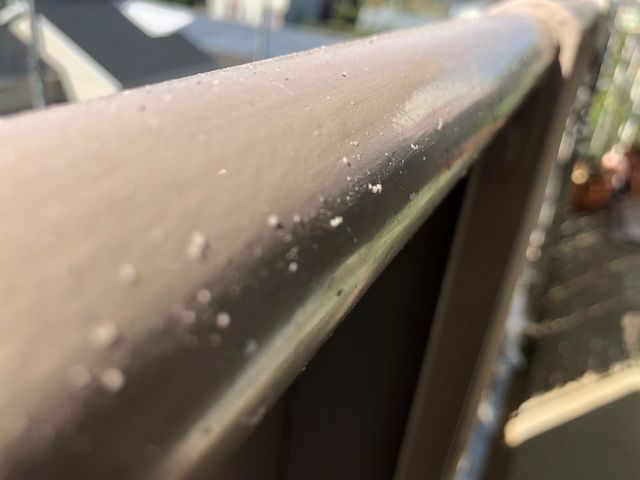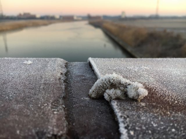 橋の欄干に落ちている鳥のフンも凍り付いて針状のミニ霜柱に覆われている。