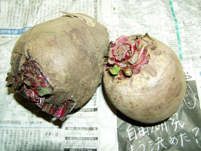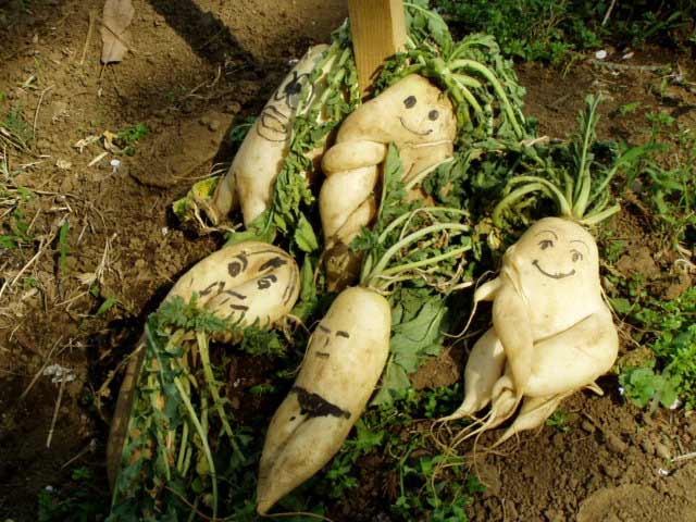 変り大根も愛嬌をふりまく。気温24℃。初夏のようで日焼けも気になる。