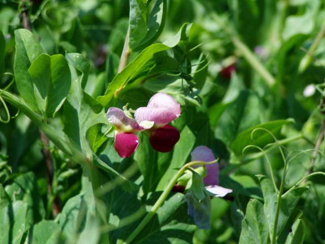 えんどう豆の花が次々に咲く。触手がさらに上を目指している。