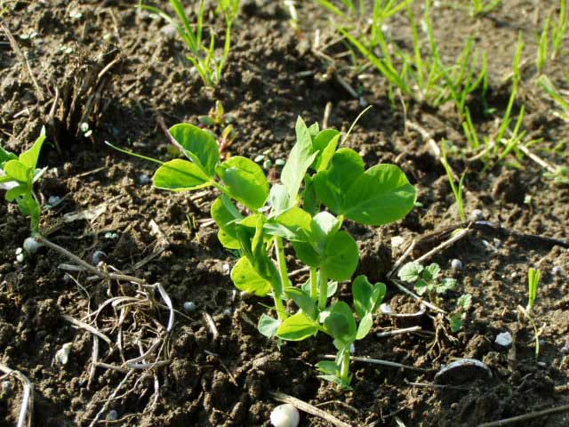 ブロッコリーとチシャ葉の苗も植える。えんどう豆の”手”を土手で調達。触手の巻き付き準備完了。