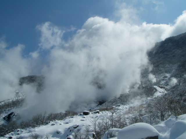 翌日は大涌谷へ。雪と熱い温泉と蒸気が同居する面白い景色だ。亜硫酸ガスで植生が変わり、ガスに