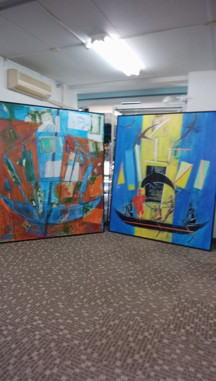 今回の公募展入選作品は古キャンバスで3,4回は使用した 強者でした。作品によっては新キャンバスが好ましいです。 剥がしては描くと言っても贅沢な身分では無いので2枚の内 では1枚は古キャンと言う具合です。自宅制作ではS100が 限界ですので悩ましい現状なのです。以前キャンバス裏側に 描いている人が居て記憶にあります。若いヒトでしょうか。 Color,Depth,Width,Compositionが絵の表現として基本だと 以前ジャカルタのベル会話の先生が言っていました。さらっと 言われても理解表現は困難な山登りです。それでも将来個展 の時にはどんな会話をすれば良いかという問いの返答です。 木枠を外してしまうとネジ穴が合わなくなるので付けたまま テープで覆い描きました。浮いたりして不具合のある木枠を ドナタカが直してくださり会場ではキチンとしていました。感謝。 古キャン故に深い色とその上の強い絵具効果が出たので もう一回使用してみようかとも考えますが今度は思う色が出ない に違いありません。絵画公募展では一般人ですのでアチコチ トライして腕試しです。山のどの辺まで登っているのか不明です。 テーマにしている帆船やガントリークレーンは好きなモノを表現 しているので意外と楽しいです。海や湾では個性的で存在感 のある方達です。