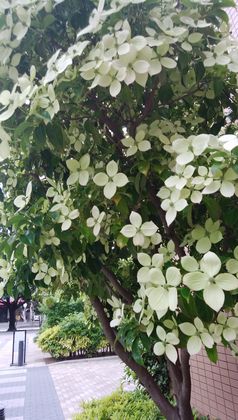 ハンカチの木と思っていたのは間違いでした。考えて見るとハンカチの木は 結構珍しいはずです。住んでいたジャカルタの街路で見かけましたがそこは お屋敷街でした。ポンドックインダの辺りだったような。お屋敷と門と外車と 使用人多の庶民とは格差のあるエリアだと思います。 我が住まいにあるのは山法師の木と花でした。刈り込まれて花が小さく なったのでしょうか。日本原産でハナミズキはアメリカ外来種と検索されます。 近所の個人宅庭先にピンクのハナミズキを植えている様子は良い眺めです。 花弁の先に特徴がみられると思いました。検索は便利です。 山法師の花言葉は友情でハナミズキは永続性とか返礼なのだそうです。 山法師の木に軸と赤いマルイ実がなっていたのを思い出しました。木の実は 誰も食べない様子ですが食べられるのだそうです。公の場所にあるものは 実もなるだけで誰の薬にも立たず落下するのみでモッタイナイ。 ジャカルタの家庭運転手にあれは何の実と尋ねたりきょろきょろと車窓ウオッチ した日々が懐かしいです。近所の空き地が刈り込まれてスッキリしていたのも 束の間ですでにうっそうとした野原に変化しつつありカモガヤも穂を出すでしょう。 野性のミントは伸びてムシも付きどくだみ草や赤まんまの花とコラボしています。 ジョギングロードの桜並木には小さなサクランボが沢山見えますがそのうちに 毛虫がつーっとぶら下がるので犬散歩コースは変更しないといけません。 水色や白い房の紫陽花が見られ紫や赤のサルビアに植え替えを済ませた 公園の藤棚では伸びすぎた藤ツルが縦横無尽に空に向かっています。