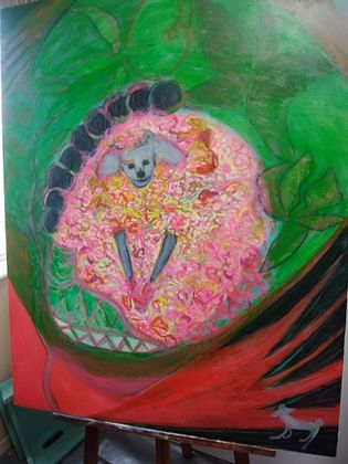 ワタシの絵は少し難しくなってきているかも知れない。 家族はエスキースの段階から全部見ているので成る程フンフン と納得してくれるらしい。描きながらカタチや色を探すタイプ なのでトンデモナク外れて自他共に迷走するときもある。 守ってあげる、今回は犬をテーマに3枚描いた内の一枚だ。 レモンバームの花を摘んでベランダを汚さないようにしたが フワッとまとめただけの花の中にそらくんが居た。そして 最近は色んなモノやカタチに見える絵が面白いと思っている のでミイラのりんごちゃんも手前に入れた。きれいな色で 描いていたがドンドン強くなり全体のカタチは以前失敗した に似てきて焦った。しかし今描きたいモノが描けた。 緑と赤は一寸タブーな色使いと言えるかも知れない。 他の2枚はマトモな範疇に入ると思う。サインが苦手なので 犬を描いたりしている。Mさんにない方が良いと思うよと 言われてなるほどと思った。一寸遊びすぎたか。 家族でインドネシアに8年近く滞在する前は何を描くか苦労した。 しかし赤道地帯の玉手箱を少し覗いてみたお陰で描くモノが 沢山出来た。ある意味で絞らないといけない段階に来ている。 タシロ先生のお陰で勉強は沢山している。集約して何を描く のかだ。ヤハリ種や花や帆船やガントリークレーン等が良い。 先のりんごちゃんは狸体型のポメラニアンだったので絵に しにくかった。そらくんは痩せ犬なので骨格がきれいで デッサンしやすい。 絵は構図や色が大切だ。和紙を貼ってみるが新聞や布を貼る 人も居る。今はコロナ騒ぎでアトリエに行かない。4568910と 休む。遠いのと膝を痛めたので自主回復でママナラナイ。 普段歩いて15分くらいの近所の歯科医院も30分位掛けて 歩くので熱中症になりそうで窓口で年号日付記入があやしくて 呆けと間違えられたとガックリ。体調が悪くなり気を付けて 道を眺めると同じようなヒトがナント多いことか。階段を 降りる時が痛いので傘と杖が一体化したのが欲しい。しかし なんとしても自力で治したい。大腿筋が弱っているらしい。 先日の新宿定期通院は結構勇気が要った。ナント過去最高の コロナ数だった東京である。主治医は随分痩せたように見えた。 医療現場のご苦労が想像出来すぎた。街はガラガラでエナジー ドリンクでランチ。色々注意して帰宅した。外出して初めて 知る日本の現状もある。古希でも色々見て考えねば。