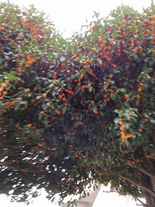 柿の実、柊の垣根、刈られて見通し良い街路樹と空。![]()