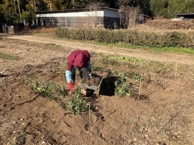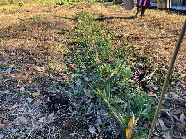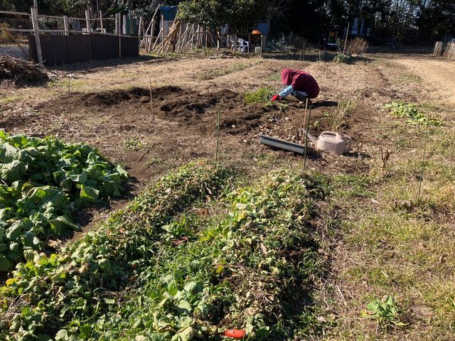 している苗が隣の畝にあるので間引きがてら移植をしてみたい。枯れ葉と不織布で寒さ