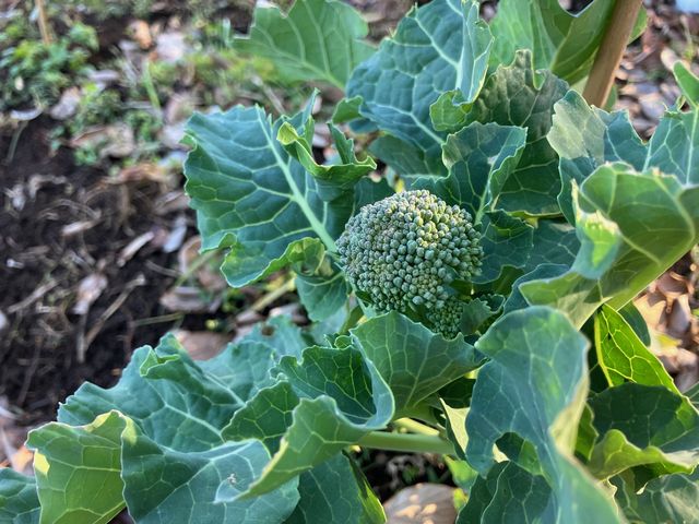 我が家の畑で一番寒い場所に植えたスティックブロッコリーとケール、日陰で寒そう