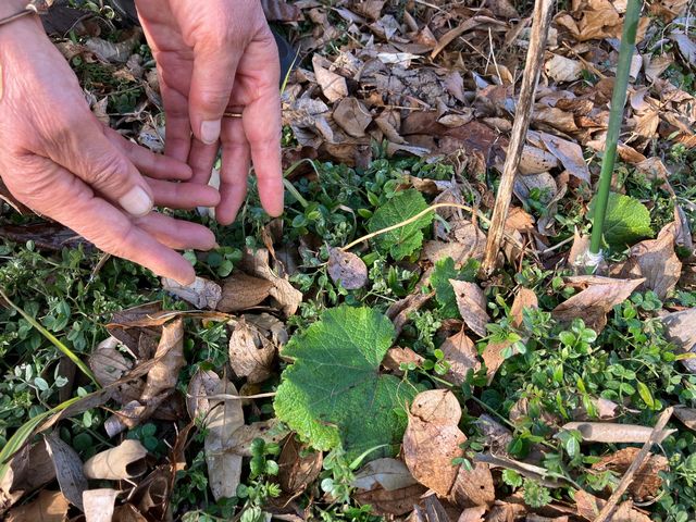 乾燥している花壇だがタチアオイの芽が伸びていた。