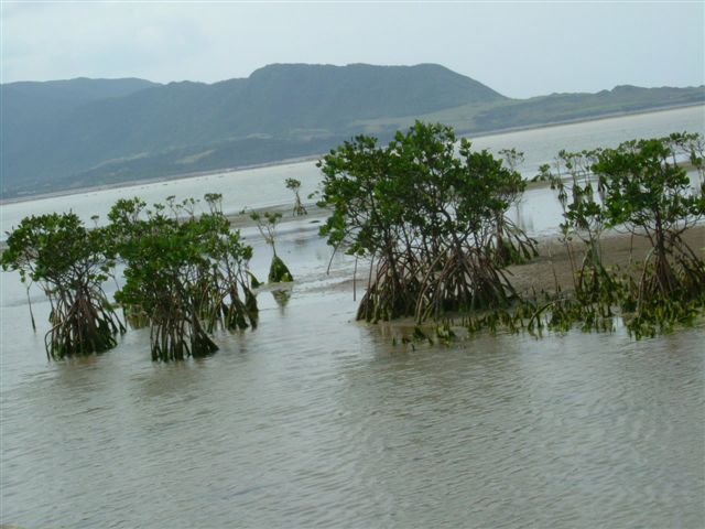 日本の植物とは思えない、海の浅瀬に生えてるひるぎ(マングローブ)の木。この横の防波堤