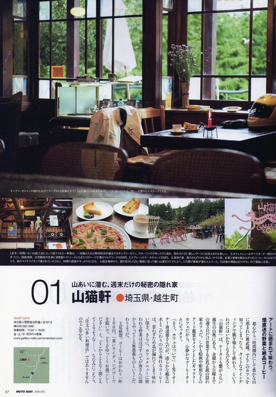 カフェに行こう (2009年11月1日) (くろまめ) 先日山猫軒のオーナー南達雄さんから雑誌が届きました。私達が訪れたことへのお礼も添えられていました。 訪れた日もそうでしたがお客様はそれぞれの席でゆったりくつろいでいらっしゃいました。 大人のモーターサイクル・スタイル誌『MOTO NAVI』12月号より。 |