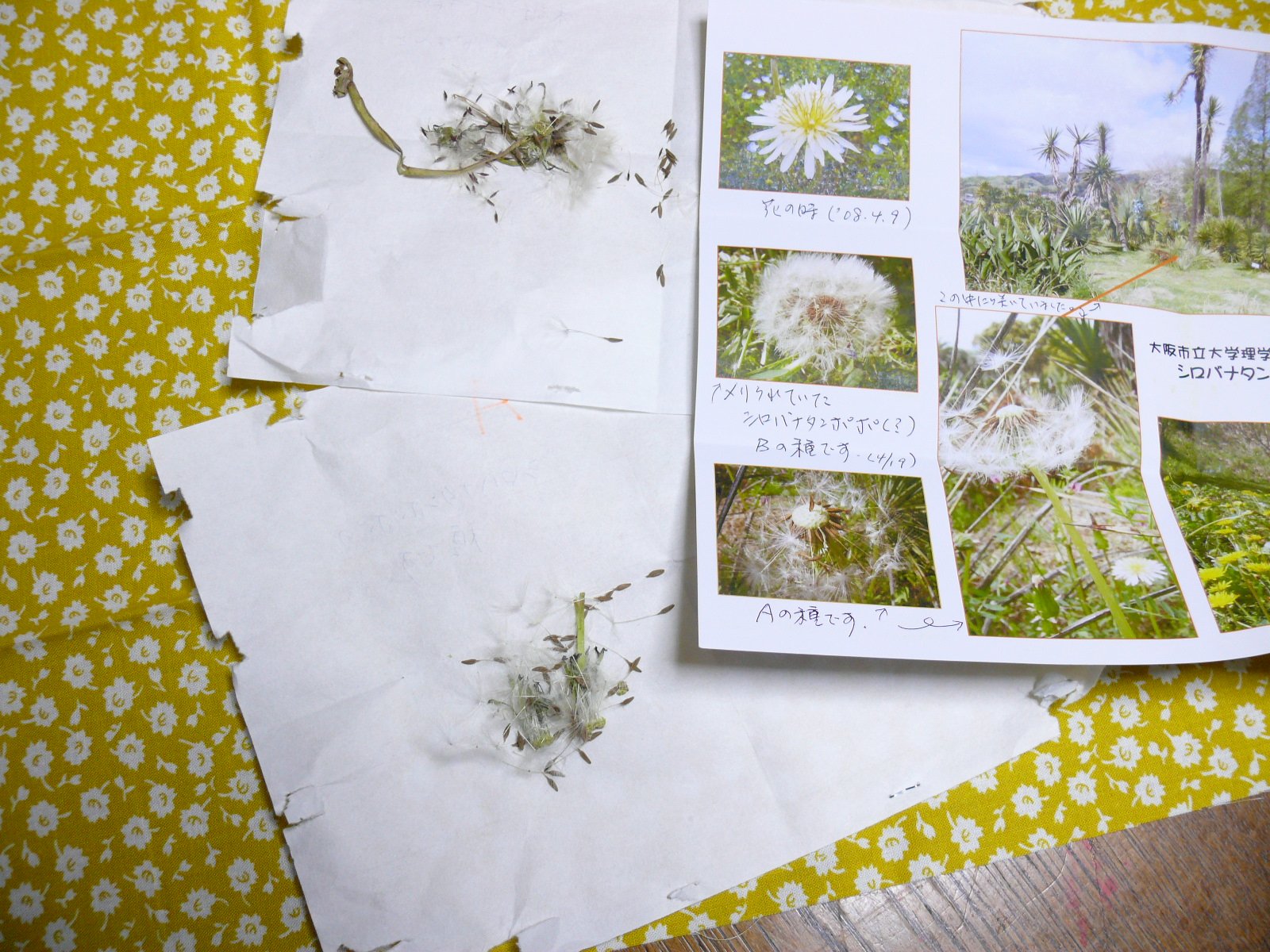 神田ウォーク (2009年5月9日) (あやめ) 今日はお付き合いいただき また美味しいお弁当をご馳走になり有り難うございました。 とても楽しゅうございました。 早速 白花タンポポをひたひたの水を含んだコットンの上にのせました。 |