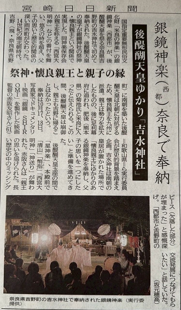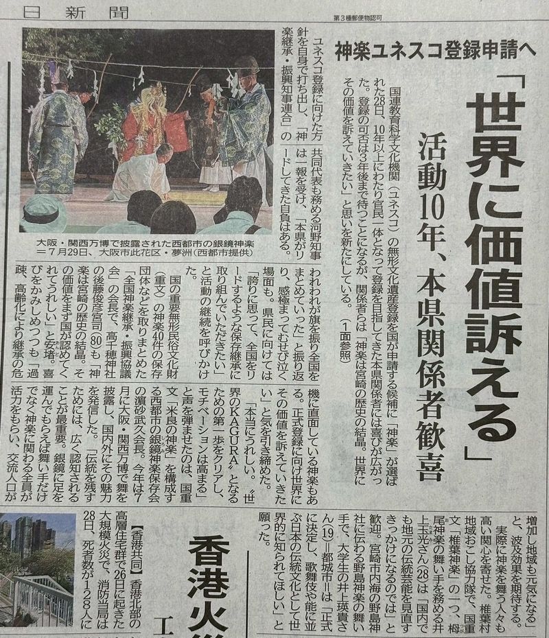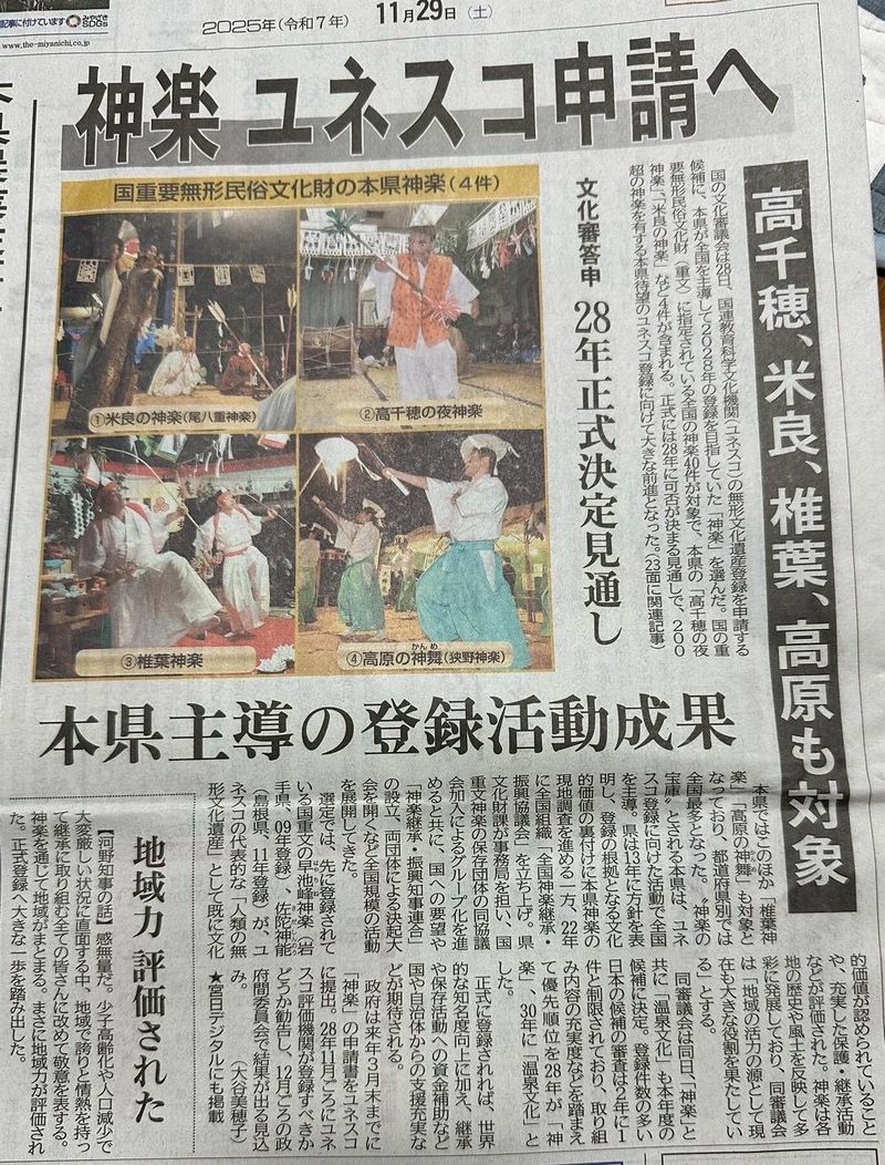 本日、宮崎日日新聞にて「神楽ユネスコ申請へ」の記事が掲載されました。