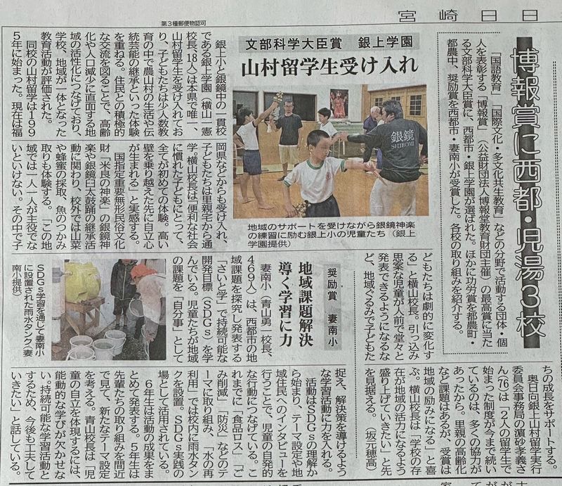 12日(水)に西都銀上学園の文部科学大臣賞受賞記事。