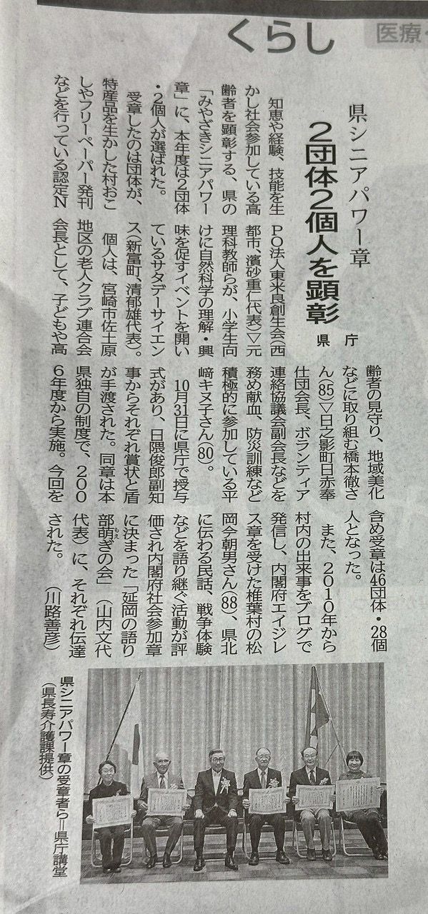 11日(火)に認定NPO法人東米良創生会の宮崎県シニアパワー章授章記事。