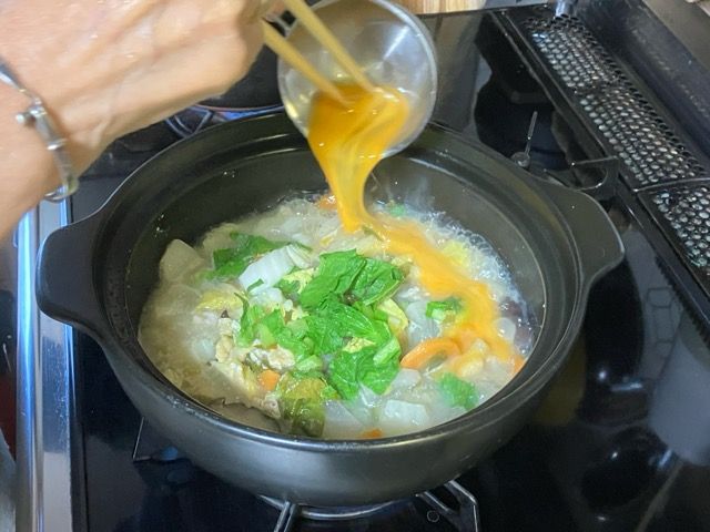 キノコや根菜たっぷり入れた豚汁を雑炊にしてケサエ菜の「追い菜っ葉」を投入しました。