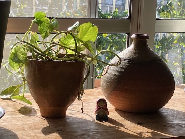 帰宅して左の壺にポトスを入れて満足。 備前焼は検索するとお値段以上のお品物でした(^ ^)。