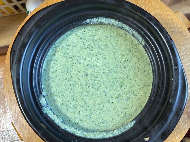 4年前から食道狭窄になり、錠剤はすべ粉砕。薬剤師さんからLINEで「お薬の準備に時間がかかります。 整いましたら、ご連絡いたします」お決まりのLINEを受けます。服用中は様々な質問がきます。 医師と連携。真面目に答え質問もします。 2月、鍋を焦がしました。鍋のそばに居たのにニオイもオトにも気づきませんでした。夫が飛んできた。 火を消した。私は完全栄養食作りを楽しんでいるところでした。事件です! それからは鍋の中をのぞき、水分量を見たり、タイマーを手中にして仕上がるまで椅子に掛けたり、 立ち上がり踵落としやスクワットを15分くらい。土鍋の蓋から蒸気が細く上がる。火を止め4分蒸らす。 私用のペースト食の下準備完了。 緑はケサヱ菜他野菜多種類。麹鶏むね醗酵バター入りどぶろくの米麹にうっとり!