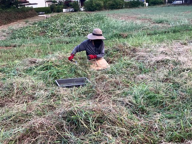 今日はランチを挟んで長い時間畑にいた。ニンニクは元気に生長しているが草取りを