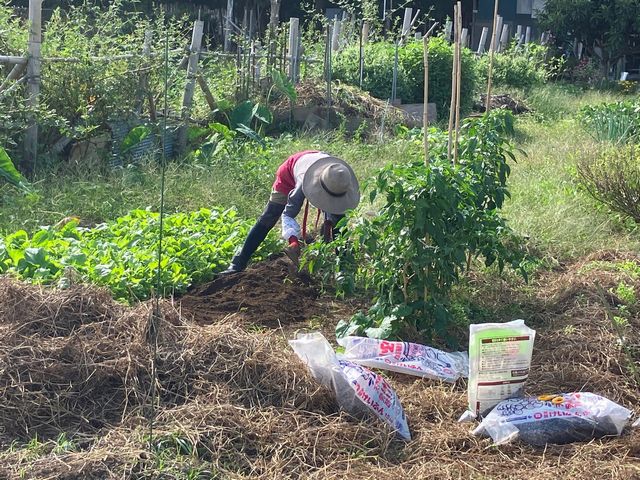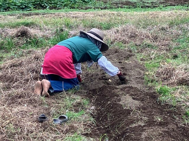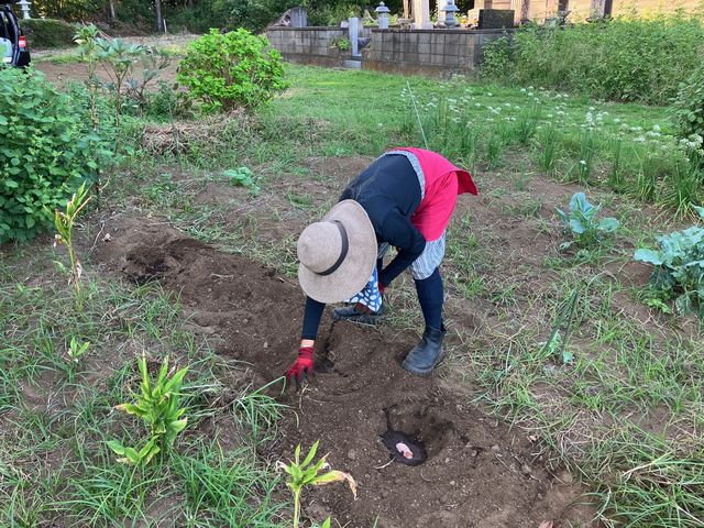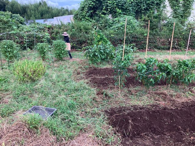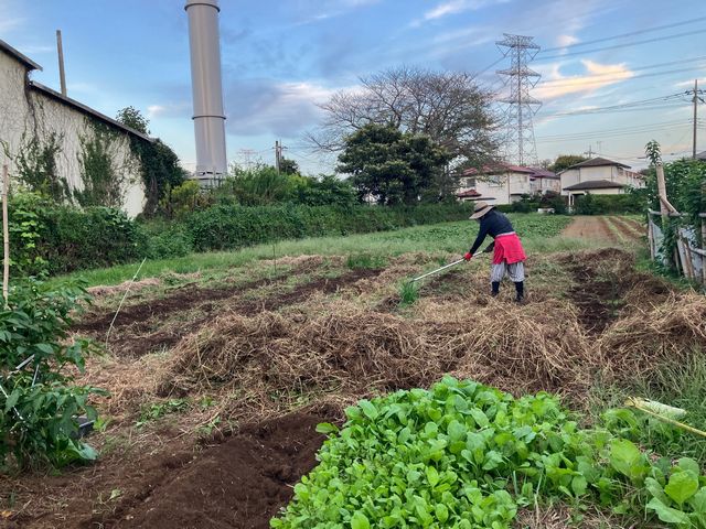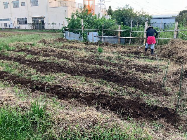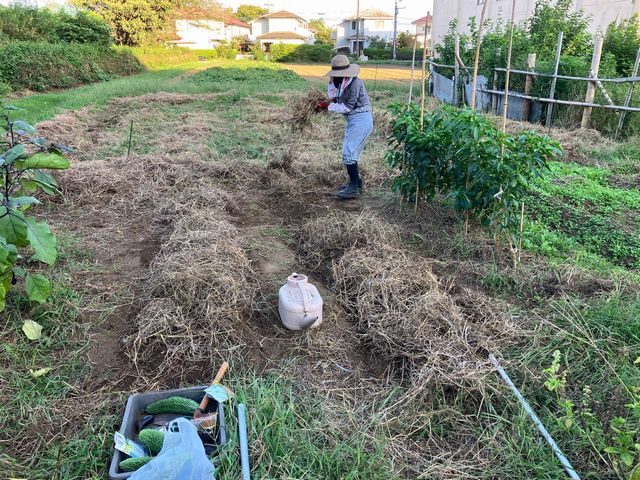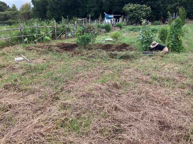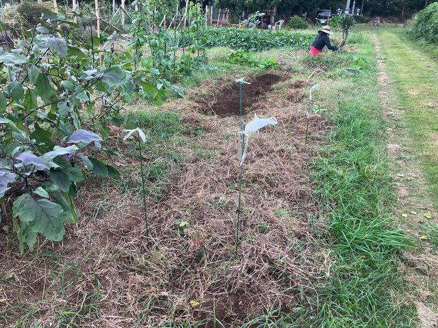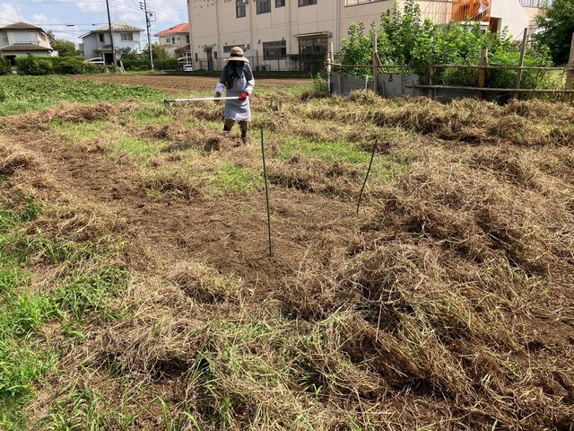 いる。クワでひっくり返して土をからませ分解をはやめることにした。