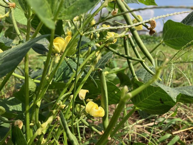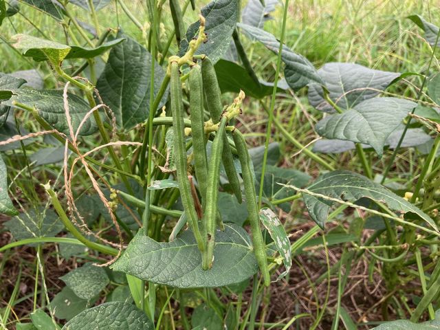 金時豆のサヤが鳥に突かれたのか無くなっていた。隣の畝の小豆はサヤが熟して茶色になって
