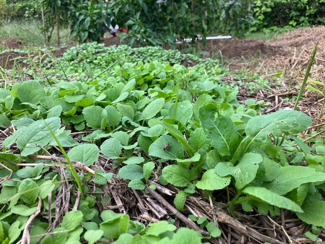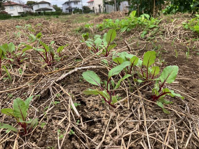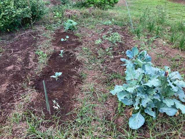 ダイコンなどまだ幼い伸び盛りの苗たちだ。ニンニクは放置している。