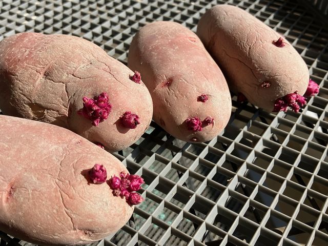 赤いジャガイモ「ルビー」の芽が出ていた。