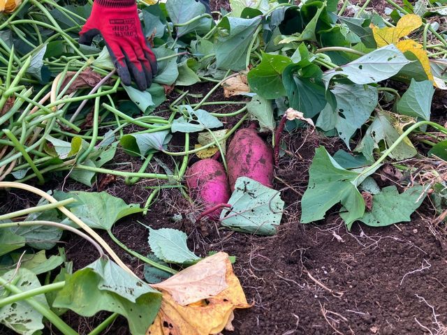 サツマイモのためし掘りをした。まるまるに太った芋が現れた。葉はまだ枯れてきていない
