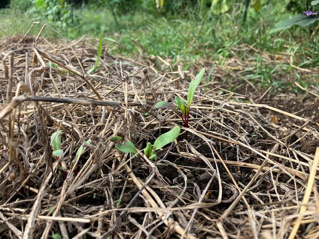 ツルが上まで達した。ケサエ菜、聖護院カブ、ビーツ、ダイコンは被せた枯れ草の