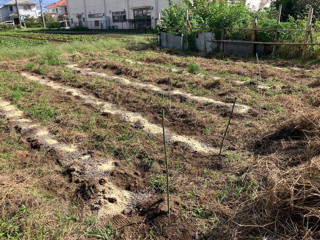 ニンニクの畝に苦土石灰、発酵鶏ふん、米ぬかを入れる。