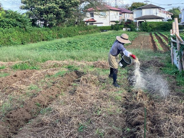 足りない場所にヌカをまく。ヌカは野菜の栄養にもなるが害虫が好んで食べるので