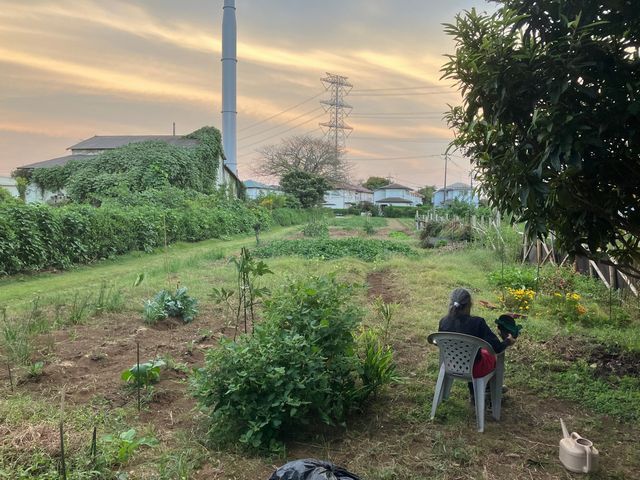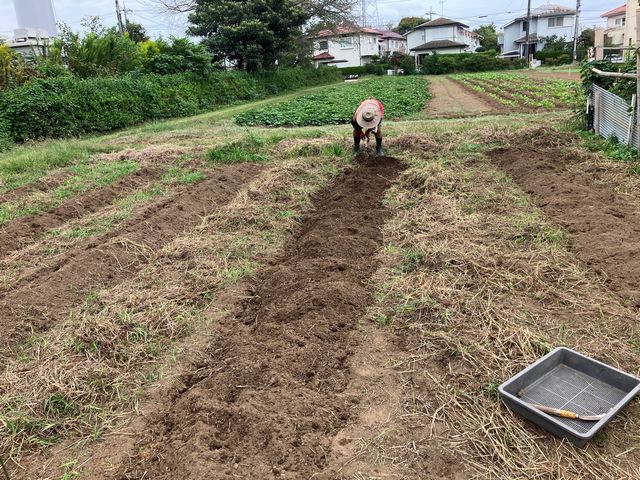 初夏のような畑日和だった。ヌカをまいて本日の作業終了。