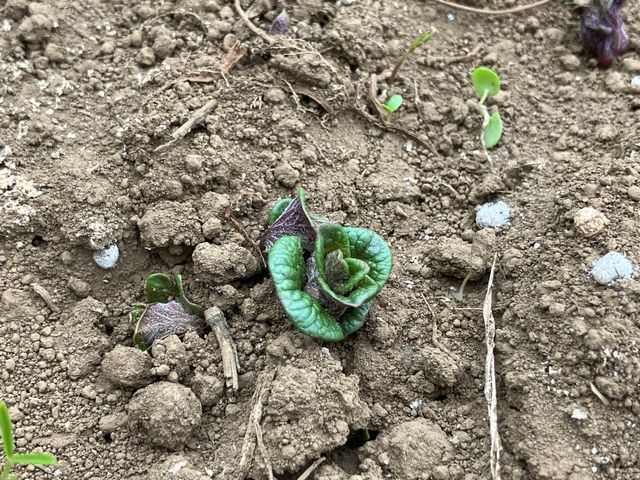 昨日の雨でしっとりとした畑の土。気温も上昇して春の陽気。野菜たちも
