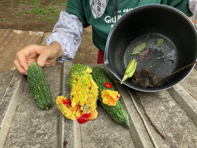 ニガウリもナスも採れすぎて追われるように消費している。鍋の中に見えるのは百合の花