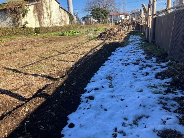晴れ。畑に向かう。道路の日陰にはまだ2日の夜の雪が残っていたが畑の日陰にも