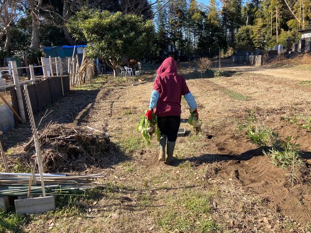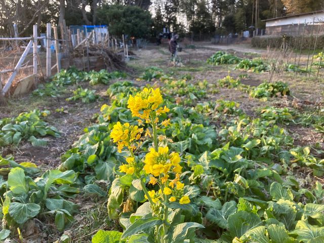 冬の畑は野菜の種類が減って少しさみしいものだがケサエ菜は根付いて花を咲かせることが